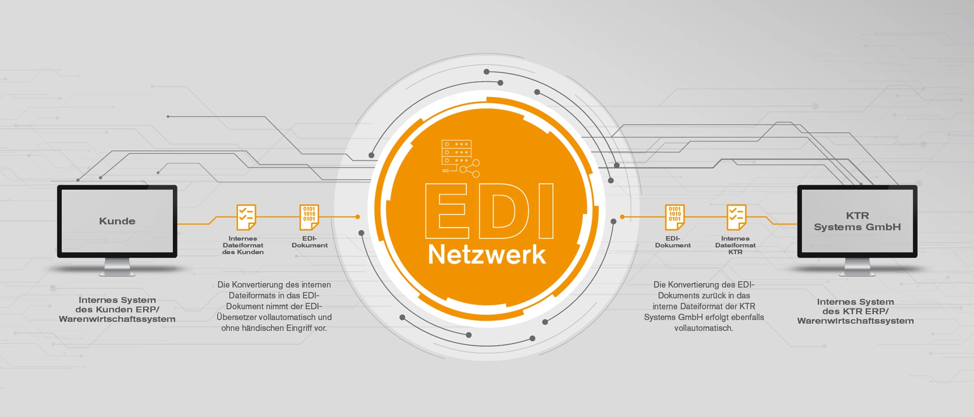 Der elektronische Dokumentenaustausch (EDI) ermöglicht Ihnen einen automatisierten, elektronischen Austausch von standardisierten Geschäftsdokumenten zwischen Ihnen und dem ERP-System der KTR Systems GmbH. EDI ersetzt die manuellen Prozesse der Bestellung und Distribution und schafft einen nahtlosen elektronischen Handel zwischen Käufer und Lieferant. EDI ersetzt die klassischen Papier-Dokumente durch elektronische Dokumente.