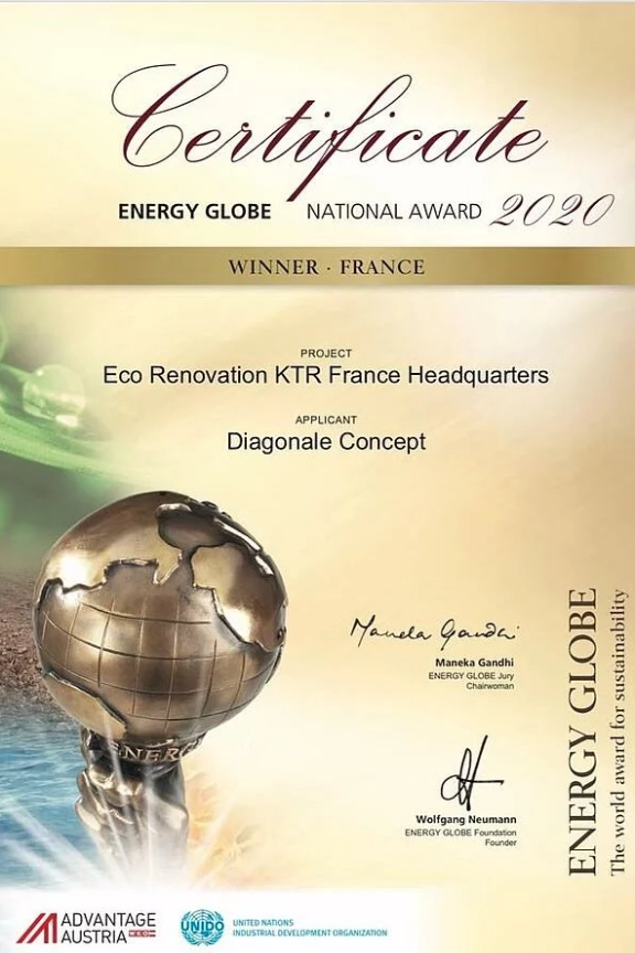 The result is a ‘building that lives and breathes’ says Pierre Martin, Chief Executive of KTR France. It is a construction that is exemplary in function – so say the organisers of the ‘Green Solutions Award 2018’ event which was hosted by the international network ‘Construction21’ – an initiative that awards prizes for buildings, urban districts and larger infrastructures for their contribution in combating climate change. Of the 60 projects selected in 2018, the KTR undertaking was the only one to receive two awards – the ‘Grand Prix Rénovation Durable’ and the ‘Prix du Public’ in the ‘Buildings’ category. In 2020, the building won the "Energy Globe Award National" France. Chapeau!